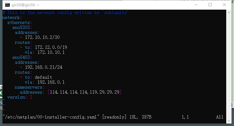 或者使用这个格式 sudo cat /etc/netplan/00-installer-config.yaml # This is the network config written by 'subiquity' network: version: 2 renderer: NetworkManager 以上使用NetworkManager管理网络 nmcli device status sudo nmcli connection modify netplan-ens192 ipv4.addresses 10.8.0.19/16 ipv4.gateway 10.8.0.1 ipv4.dns 192.168.50.2 ipv4.method manual ipv4.dns-search a.v ipv6.addresses feee:8000::19/64 ipv6.gateway feee:8000::1 ipv6.dns feee:5000::5 ipv6.method manual ipv6.dns-search a.v sudo nmcli connection down netplan-ens192 && sudo nmcli connection up netplan-ens192 回复